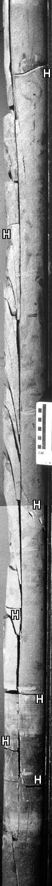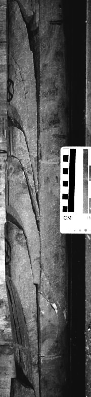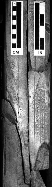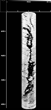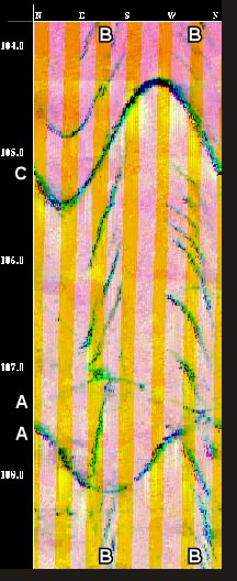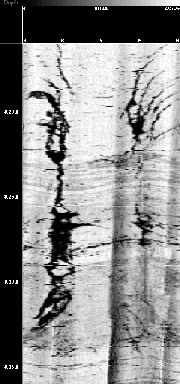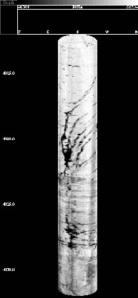 ANSWER: Image shows two natural fractures (A) and well-developed induced fractures arranged in parallel rows on opposite sides of the wellbore (B). Breakouts are absent. Fracture C is less easy to interpret because it crosses the entire borehole and is oriented parallel to the smaller induced fractures above and below it. The induced fracture immediately above C crosses into the compressive quadrant of the borehole, indicating (but not proving) that fracture C is also induced. These induced fractures appear to be post-drill, probably hydraulic, fractures rather than petal fractures because they are asymmetrically developed and nucleated in two parallel rows on opposite sides of the borehole rather than nucleating on one side of the well and propagating towards the centerline. Note that induced fractures abut both natural fractures, which shows their relative ages. |
