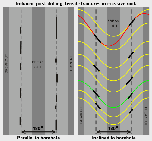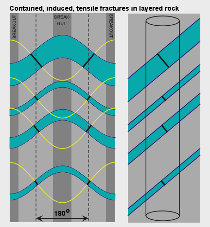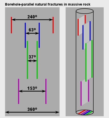 Induced tensile fractures are the most common and easily visible induced fractures observed in image logs and core. Induced fractures are easily distinguished from natural fractures in core by visually examining fracture surface morphology and the geometric relationships between the core and the fracture shape, origin flaw and propagation path (Kulander et al; 1979, 1990). Individual fractures cannot be identified positively as natural or induced based solely on the fracture trace in an image log. However, the origin of a group of fractures is determinate from image log data because natural fractures and induced fractures have different geometries relative to the borehole. If breakouts are present and if the natural fractures formed in a stressfield significantly different from the present-day stressfield, then the orientation of the fractures relative to the breakouts provides an additional (though less rigorous) criteria for distinguishing the two types of fractures. This webpage provides some simple rules for using image logs to differentiate natural fractures of all types from induced tensile fractures and to distinguish induced fractures that form after passage of the bit from petal and petal-centerline fractures which form ahead of the bit. These other pages on this site provide useful background material for this page:Breakout and induced fracture basics Regional fracture orientations |